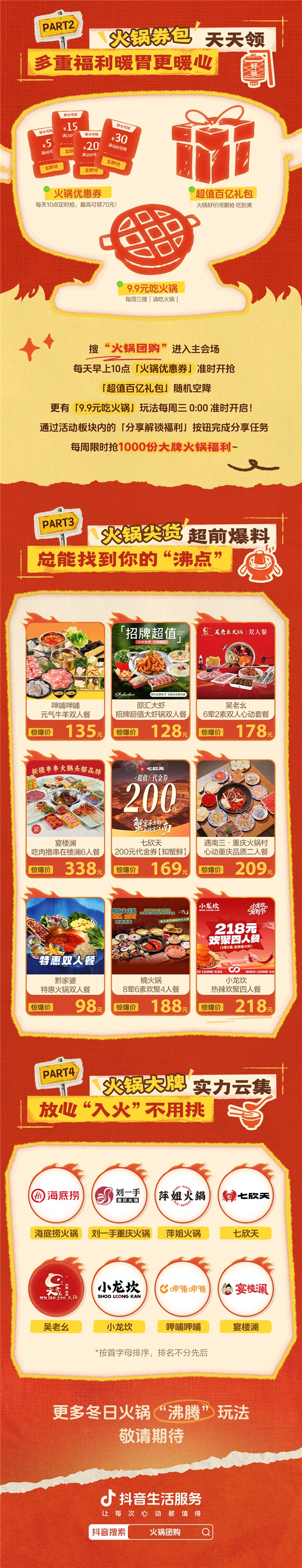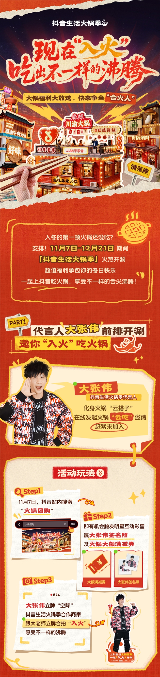 降温了,是时候组个火锅局暖暖胃了。可出门前总会陷入熟悉的纠结——麻辣锅还是酸汤锅?去哪家店不踩雷?怎么才能吃得爽还划算?别再陷入选店、点菜、比价等一系列“饭前拉锯战”啦!现在跟着「抖音生活火锅季」一起“入火”,即刻收获“不一样的沸腾”快乐!上抖音搜索「火锅团购」 ,不仅有机会触发明星互动彩蛋,赢大张伟签名照,还有超值火锅优惠券、每周三零点“9.9元吃火锅”等惊喜福利等你来抢!更多火锅尖货套餐、火锅大牌惊爆价一触即达!超全活动玩法戳下图解锁,赶紧跟着代言人大张伟一起前排开涮吧!